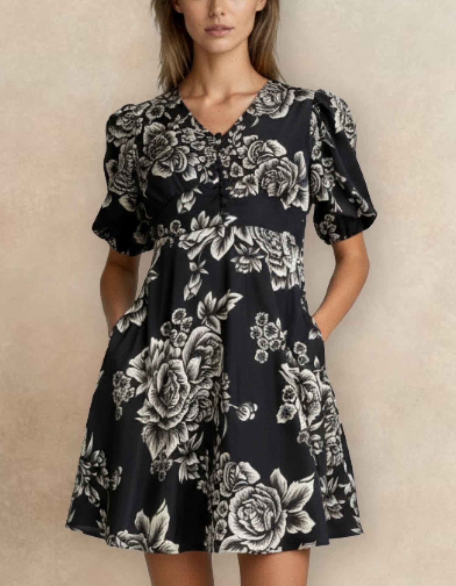 The Lottie dress brings a romantic flourish to your wardrobe with its flattering fit-and-flare silhouette and soft, flowy sleeves. Featuring an elegant floral print on a black base, this dress is designed to highlight the waist and offer easy movement with every step. Perfect for brunch dates, casual gatherings, or effortless day-to-evening looks, the Lottie dress is all about timeless charm with modern ease.