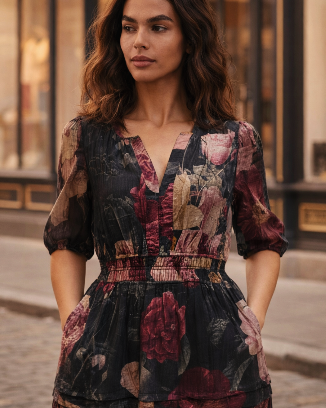 Romantic and timeless, the Catherine dress features a vintage-inspired floral print in deep autumn tones. Designed with a flattering smocked waist, soft puff sleeves, and a flowing tiered skirt, it brings effortless elegance to your everyday look. Crafted from a lightweight textured fabric, it’s perfect for both casual outings and special occasions — just add boots and gold jewelry for a chic seasonal touch