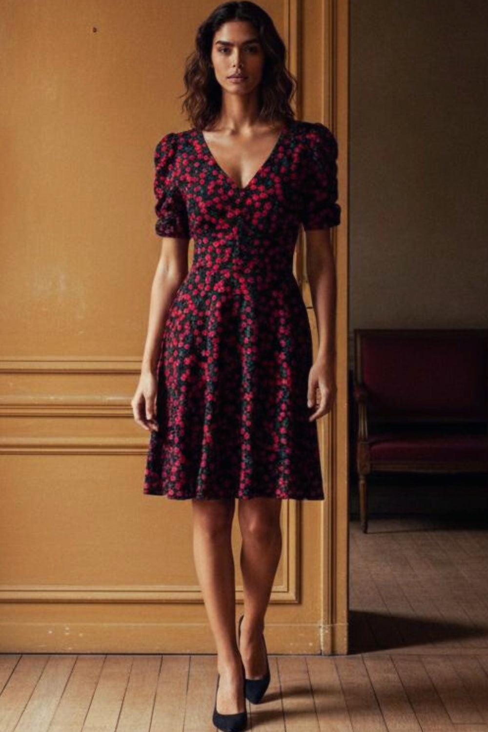 The Cindy dress is a fresh twist on a vintage classic. With its flattering fit-and-flare silhouette, soft puff sleeves, and V-neckline, it highlights the waist while staying breezy and comfortable.
