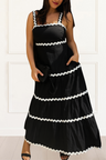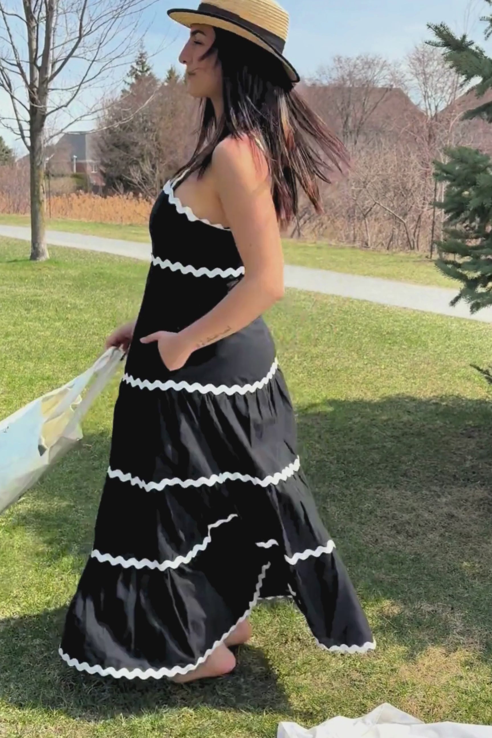 The Sienna Maxi Dress is a warm-weather stunning style with timeless contrast and effortless charm. Designed in crisp black cotton with white ric-rac trim, it features adjustable straps and a flared tiered hem for playful movement. The elasticized back panel adds stretch and shape, while the full cotton lining keeps it breathable and comfortable all day long.