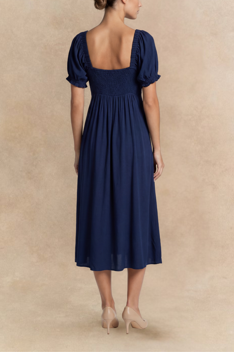 The Genevieve midi dress features softly gathered bell sleeves and a delicate front tie that adds subtle shape at the neckline. Designed with a relaxed, flowing silhouette and practical side pockets, it offers comfort without sacrificing style. An easy, feminine piece that works beautifully for everyday wear, casual gatherings, or dressed up with simple accessories