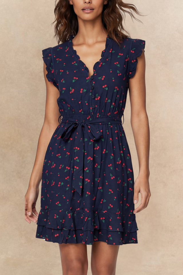 Sweet and effortlessly feminine, the Natasha cherry print dress brings a playful update to this best-selling silhouette. With flutter sleeves, a ruffle-trimmed neckline, and a removable self-tie belt at the elastic waist, it flatters every figure while keeping things light and breezy. Side pockets add function to its flirty charm. Made from breathable light weight fabric for a breathable, flowy feel