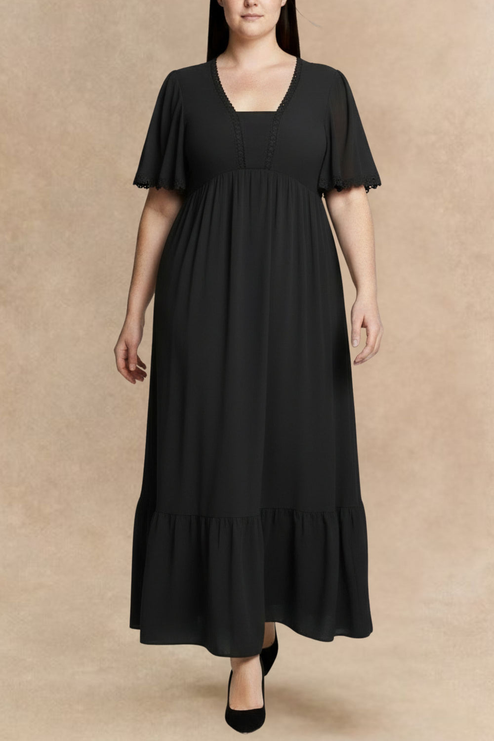 Elegant, feminine, and effortlessly flattering, this maxi dress features a soft V-neckline framed with delicate lace trim and airy flutter sleeves. The empire waist enhances the silhouette with gentle definition, while the flowing maxi skirt offers beautiful movement and comfort. Crafted from a lightweight drapey fabric, this dress is perfect for casual days, special events, or effortless chic evening looks. Plus Size dress.