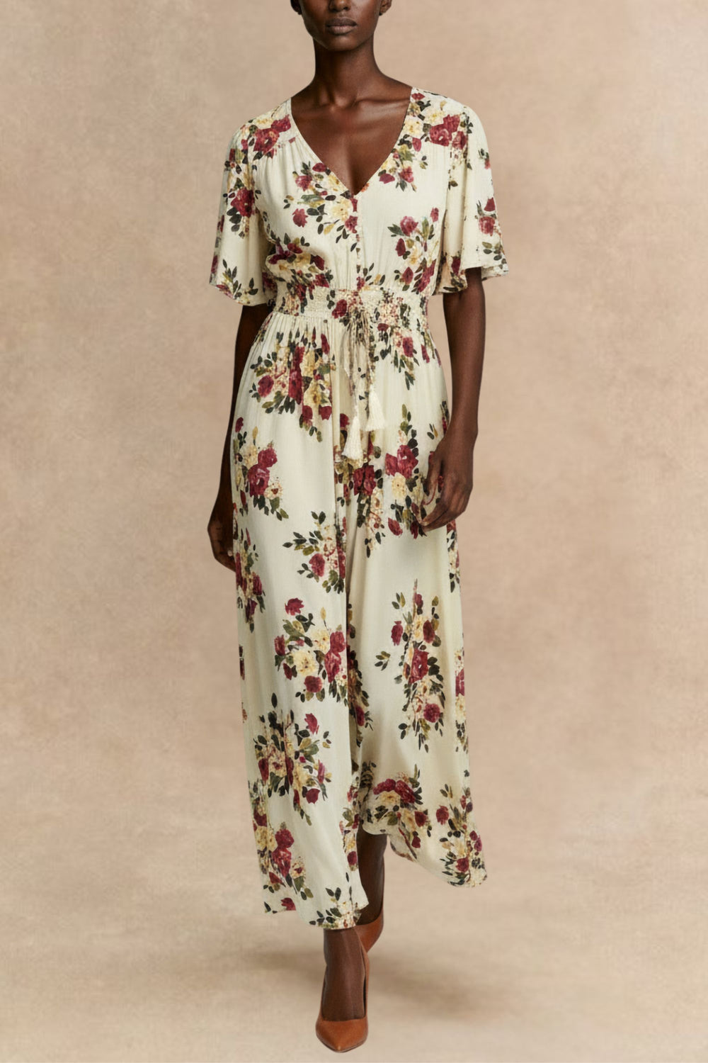 Elevate your everyday elegance with this romantic floral jumpsuit. Designed with a flattering V-neckline, short flutter sleeves, and a smocked waist, it enhances the silhouette while offering all-day comfort. The wide-leg cut creates a fluid, graceful movement, while the soft floral print adds a timeless, feminine touch. Lightweight and breathable, it’s perfect for brunches, vacations, garden parties, or relaxed chic evenings