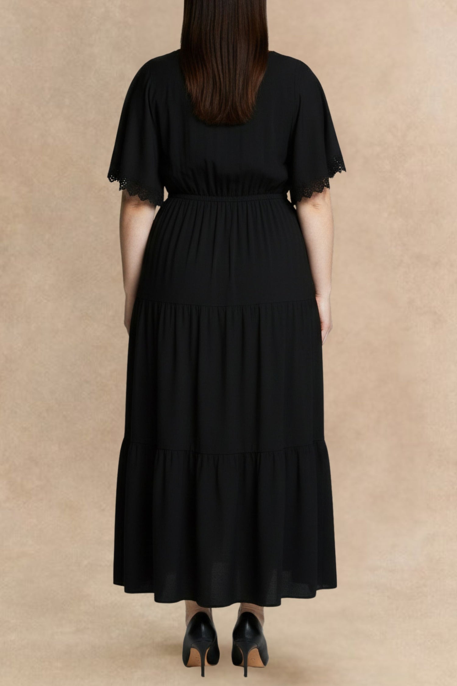 Elegant, feminine, and effortlessly flattering, this maxi dress features a soft V-neckline framed with delicate lace trim and airy flutter sleeves. The empire waist enhances the silhouette with gentle definition, while the flowing maxi skirt offers beautiful movement and comfort. Crafted from a lightweight drapey fabric, this dress is perfect for casual days, special events, or effortless chic evening looks. Plus Size dress.