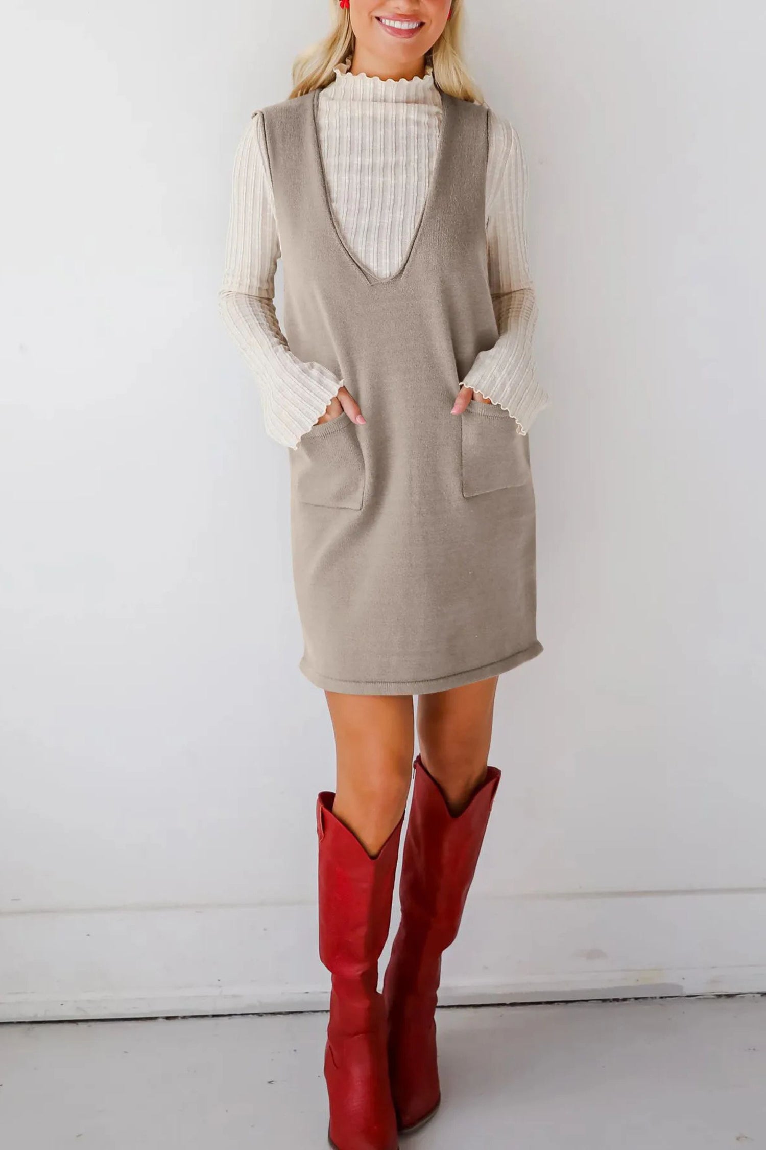 Layer up in effortless style with this sleeveless jumper mini dress, crafted in soft polyester for comfort and versatility. Featuring a deep V-neckline, relaxed shift silhouette, and functional front patch pockets, this dress is the perfect layering piece for year-round wear. Pair it with a turtleneck and boots for a cozy fall look, or style it with a blouse and flats for chic everyday wear. Available in red, grey, beige, or black, it’s a wardrobe essential for easy styling.