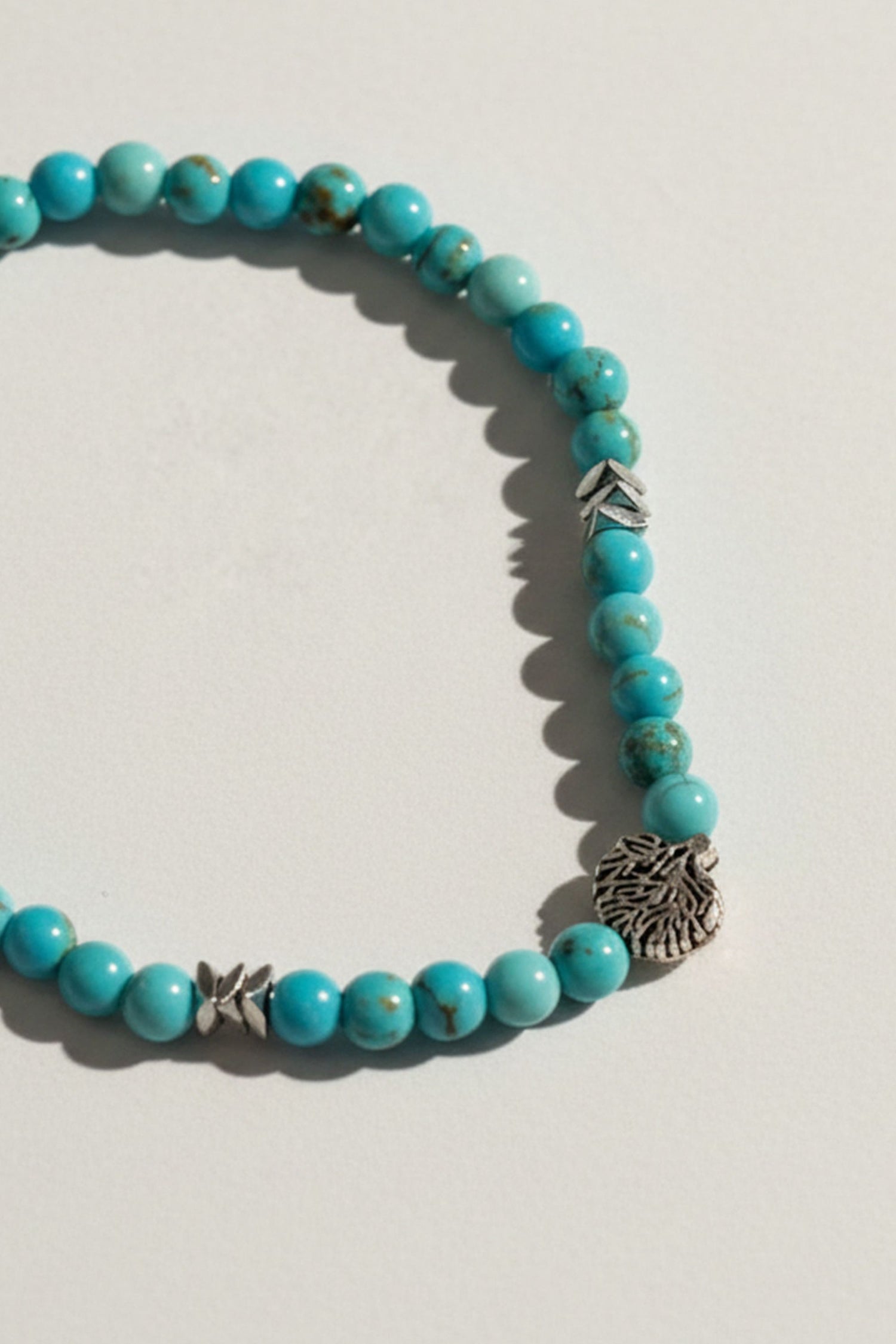 A delicate beaded bracelet crafted with vibrant turquoise-toned stones, accented with subtle silver details and a textured silver charm. Easy to wear and effortlessly chic, it adds a bohemian touch to both everyday outfits and summer looks.