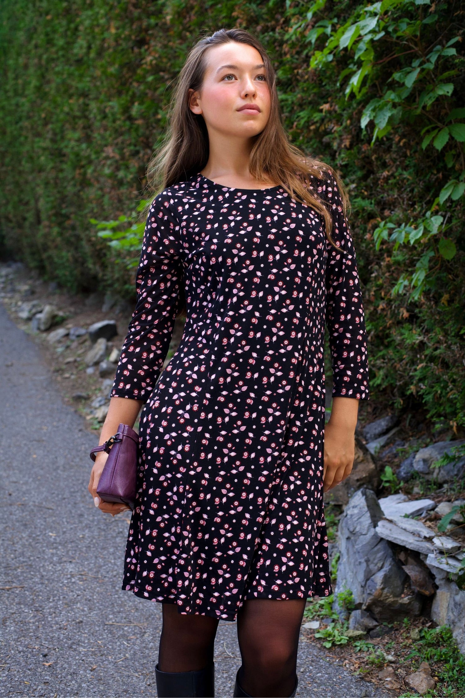 La robe Daisie revisite l’élégance classique avec une touche de fraîcheur grâce à son imprimé floral rose sur fond noir. Sa coupe trapèze flatteuse, son encolure ronde et ses manches 3/4 offrent un équilibre parfait entre féminité et confort. Confectionnée dans un tissu doux et fluide, elle vous accompagne avec légèreté du brunch au bureau, jusqu’au dîner. Un essentiel polyvalent à porter en toute saison.