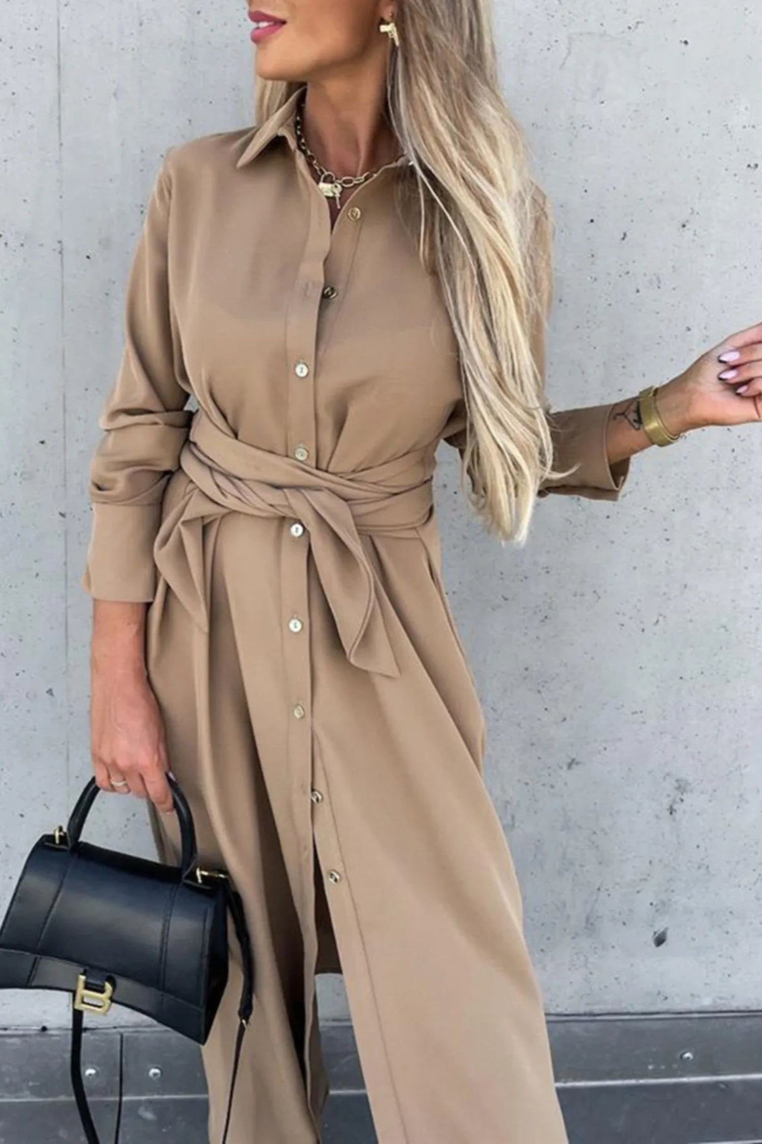 Sobre et polyvalente, cette robe chemise à manches longues allie une coupe moderne à une élégance quotidienne. Conçue avec un devant boutonné, un col montant bien coupé et une ceinture à nouer qui souligne la taille, cette robe crée une silhouette flatteuse tout en restant d'une sophistication décontractée. Disponible dans un vert émeraude audacieux ou un beige intemporel, son design soigné la rend parfaite pour le bureau, les brunchs ou pour être portée avec des bottes et un sac à main pour un look chic du jour au soir.