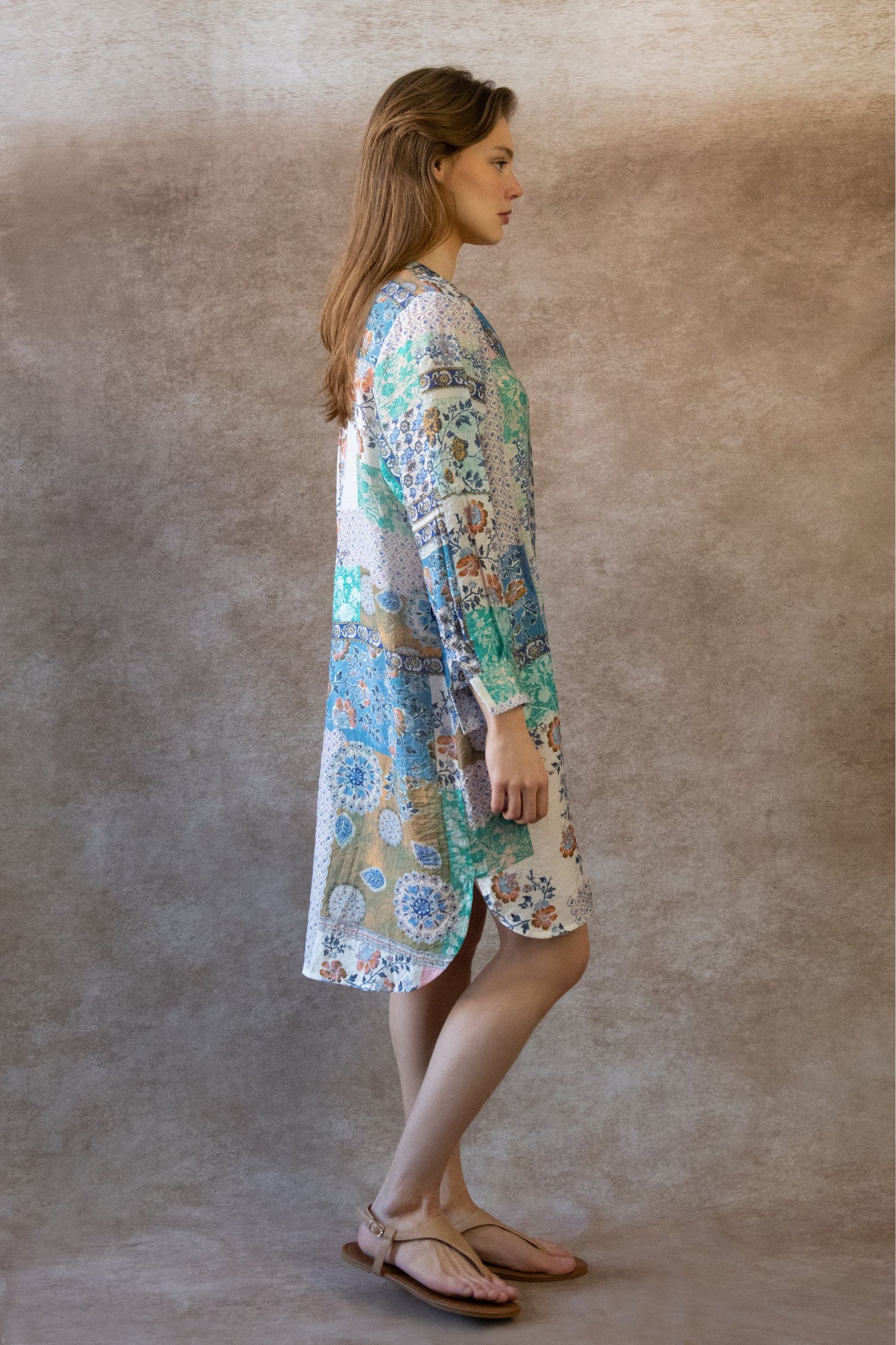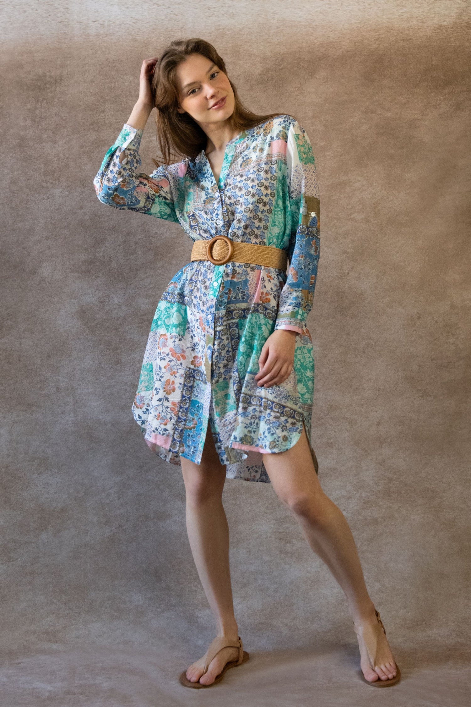 Ajoutez une touche ludique à votre style quotidien avec notre robe-chemise tunique bohème patchwork Lara à la coupe décontractée. Créé dans un tissu léger et semi-transparent, elle est dotée de manches longues faciles à retrousser, d'une patte de boutonnage et d'un col rond. Son doux patchwork de motifs et de couleurs lui confère un charme bohème naturel, tandis que sa fermeture boutonnée sur le devant permet de la porter en toute polyvalence : superposez-la ou portez-la seule. Plus qu'une simple robe, c'est l'expression joyeuse de votre style unique.