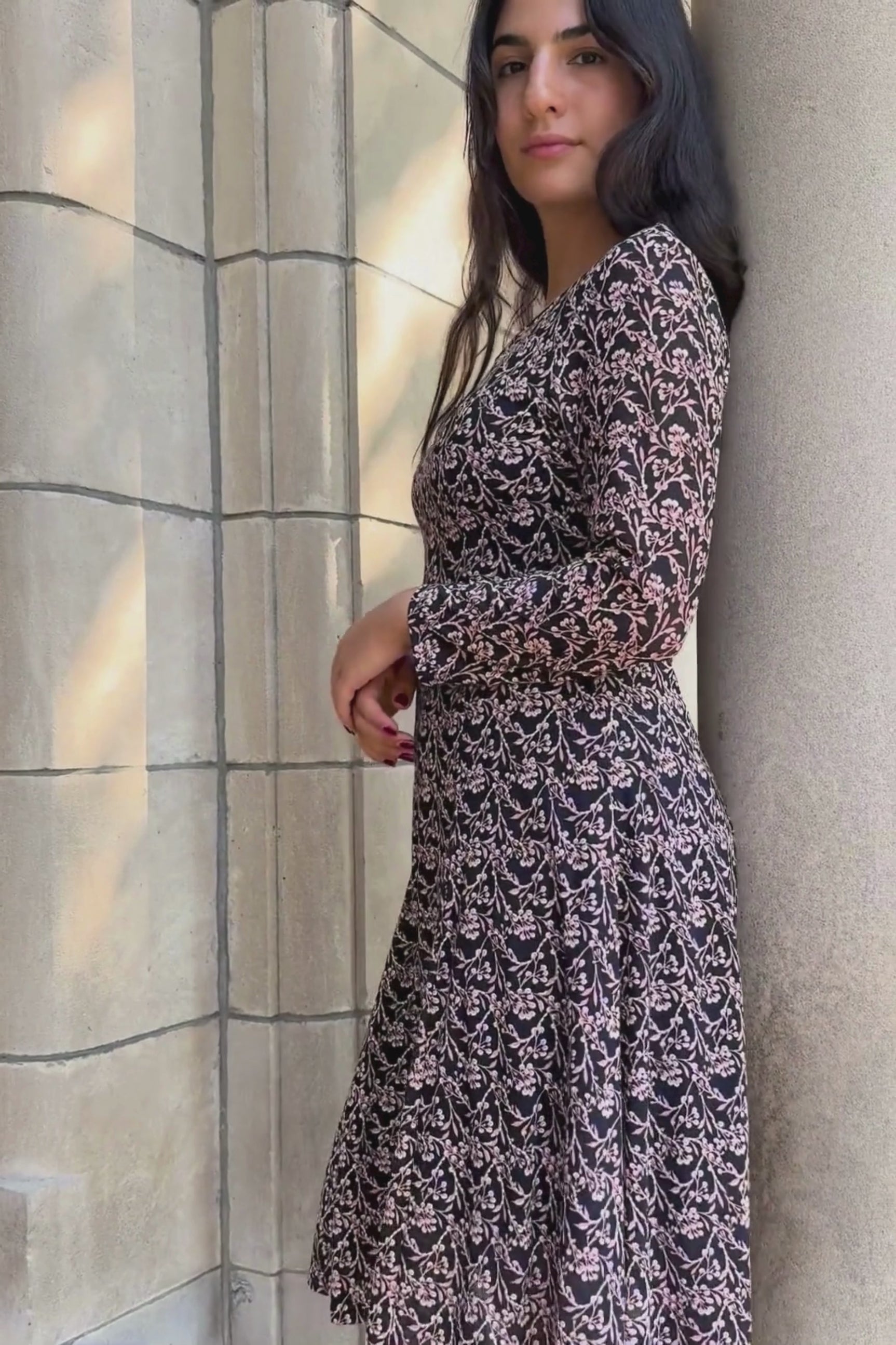 La robe Audrey incarne une féminité naturelle avec son motif floral beige sur fond bleu marine profond. Sa coupe trapèze flatteuse accompagne élégamment vos mouvements, que ce soit pour une sortie décontractée ou une soirée chic. Avec ses manches 3/4 et son col rond classique, elle se porte aussi bien avec un cardigan au quotidien qu’avec des talons et des bijoux pour une allure plus habillée. Un essentiel polyvalent au charme intemporel.
