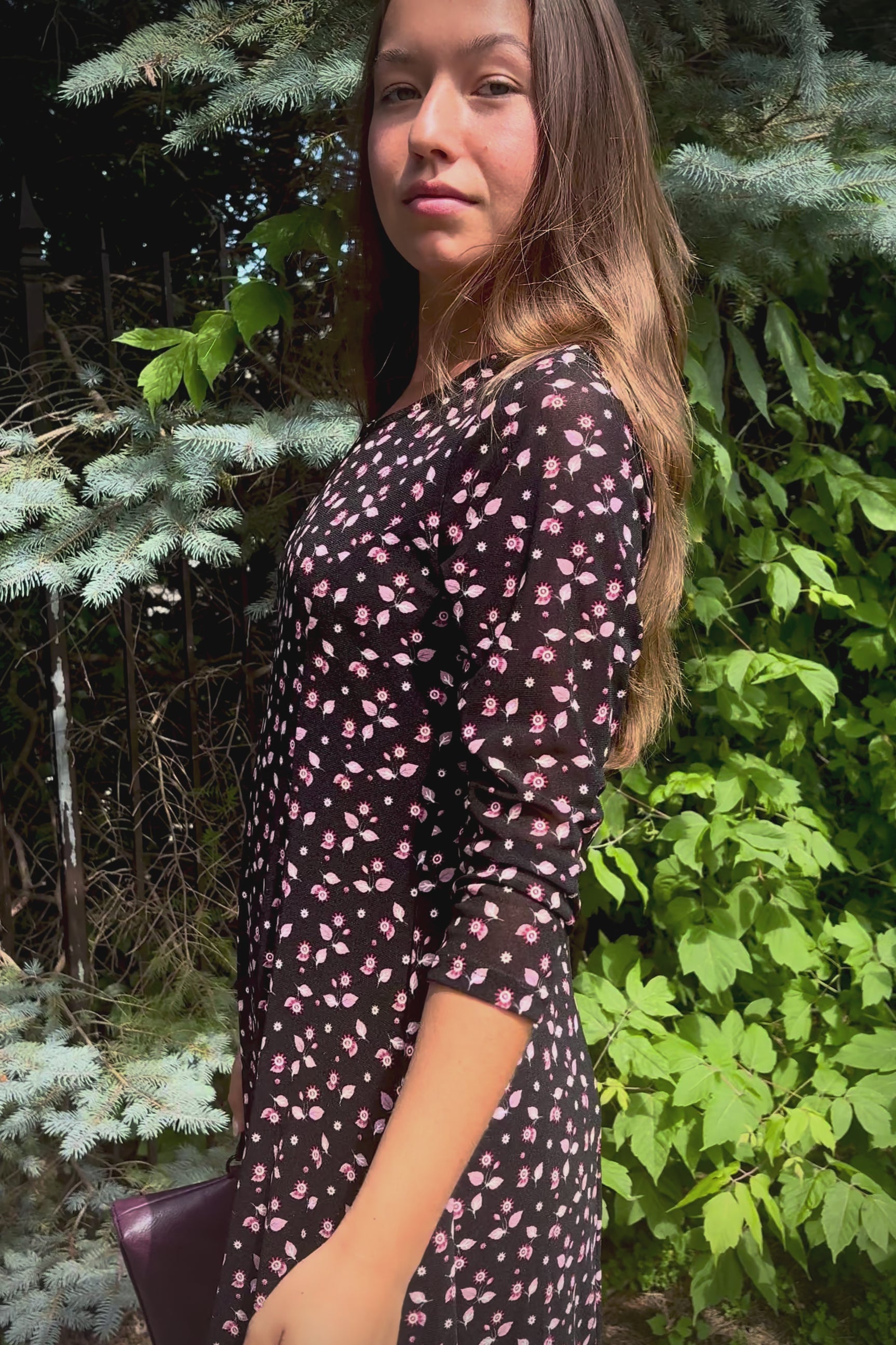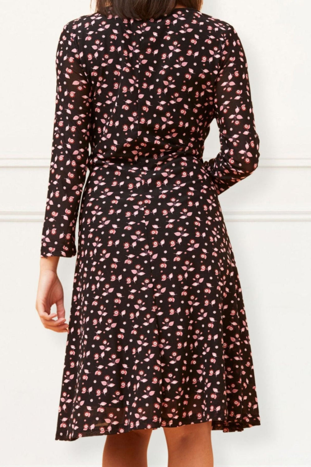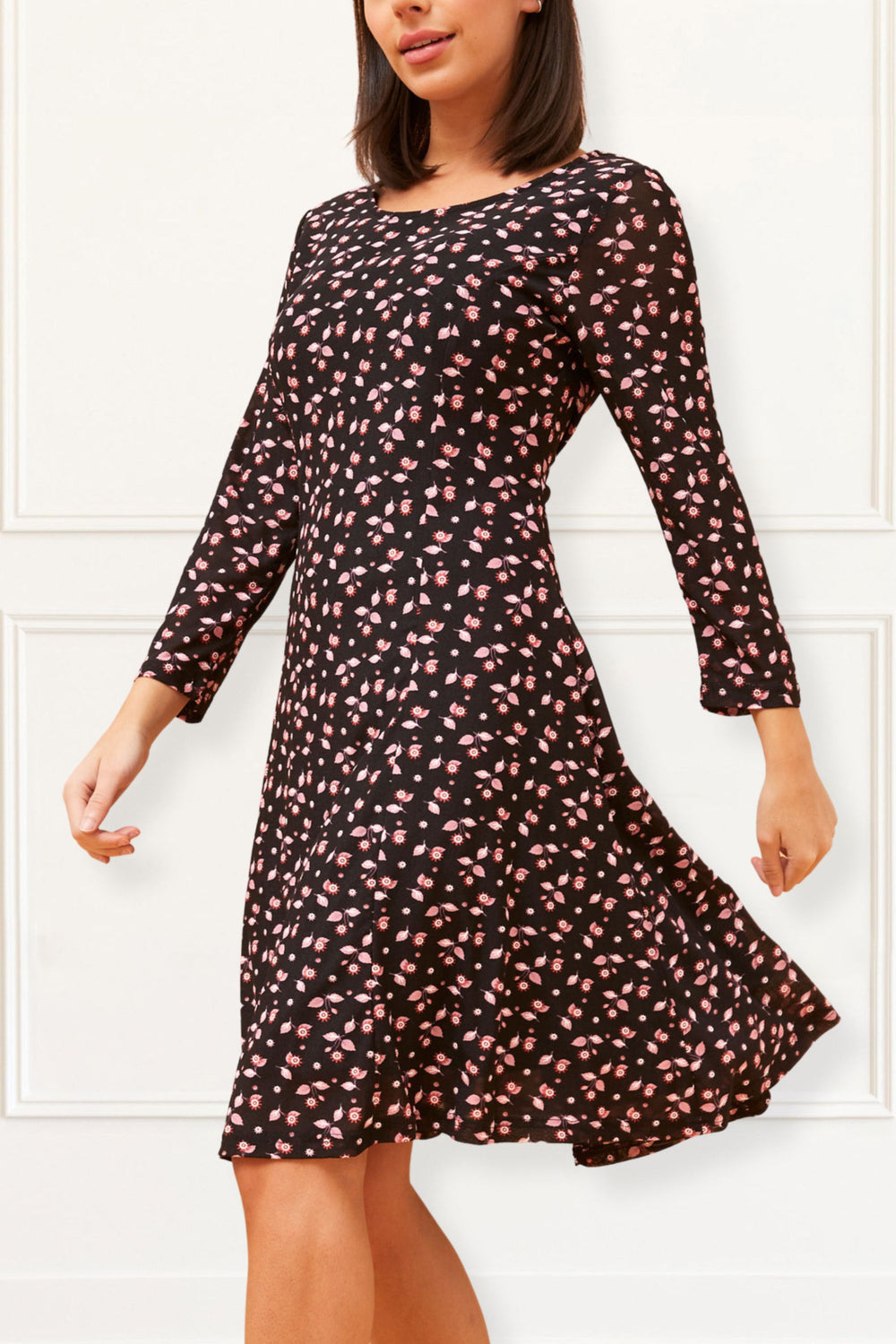 La robe Daisie revisite l’élégance classique avec une touche de fraîcheur grâce à son imprimé floral rose sur fond noir. Sa coupe trapèze flatteuse, son encolure ronde et ses manches 3/4 offrent un équilibre parfait entre féminité et confort. Confectionnée dans un tissu doux et fluide, elle vous accompagne avec légèreté du brunch au bureau, jusqu’au dîner. Un essentiel polyvalent à porter en toute saison.