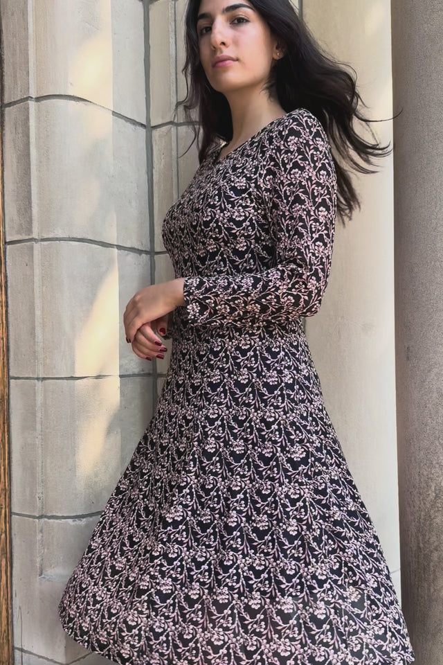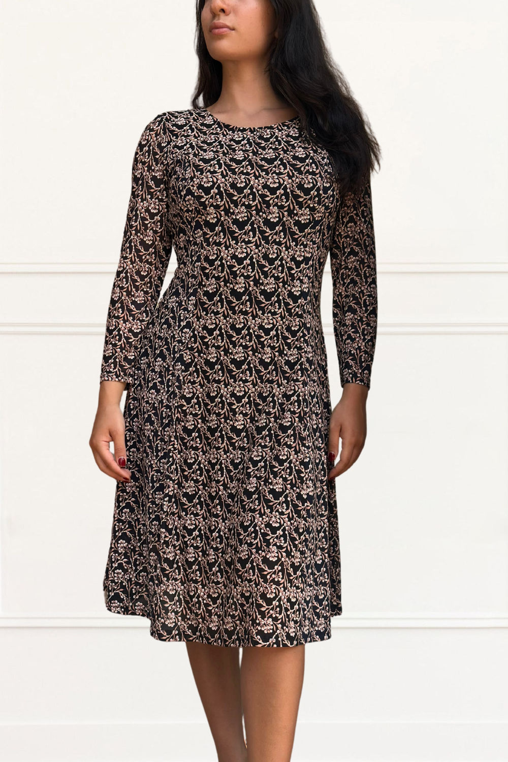 La robe Audrey incarne une féminité naturelle avec son motif floral beige sur fond bleu marine profond. Sa coupe trapèze flatteuse accompagne élégamment vos mouvements, que ce soit pour une sortie décontractée ou une soirée chic. Avec ses manches 3/4 et son col rond classique, elle se porte aussi bien avec un cardigan au quotidien qu’avec des talons et des bijoux pour une allure plus habillée. Un essentiel polyvalent au charme intemporel.