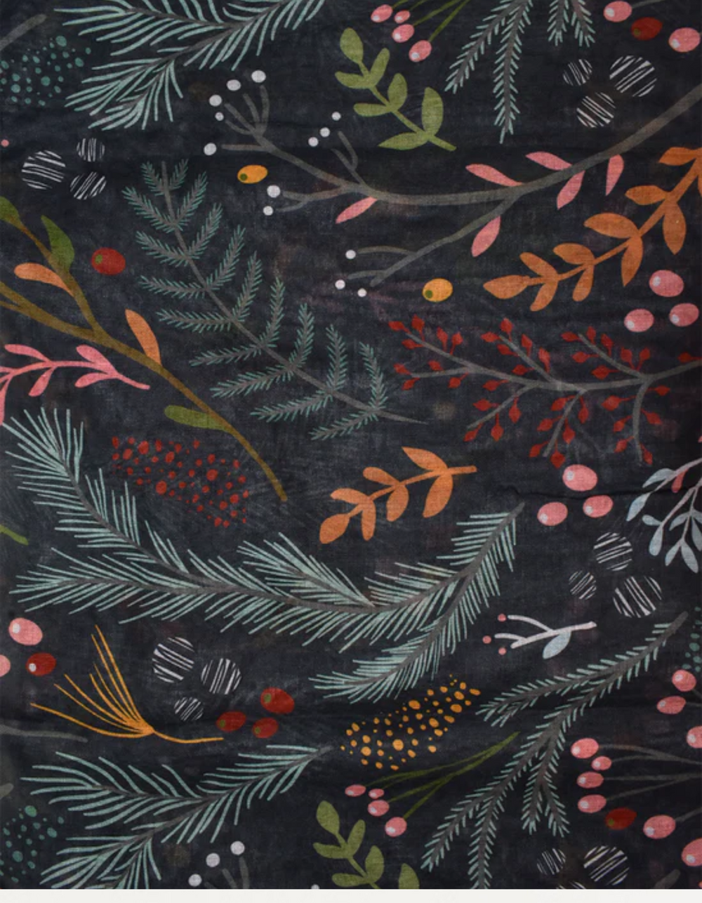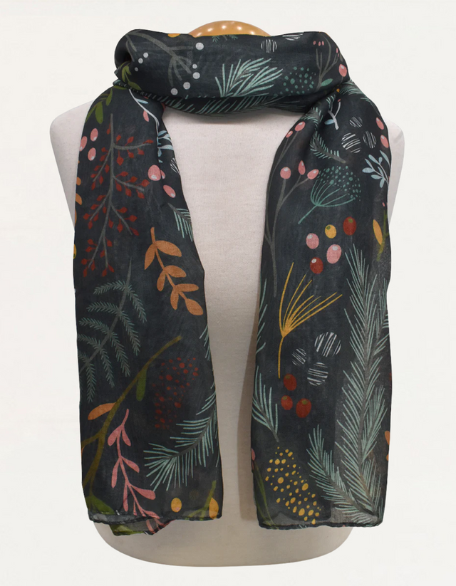 Ajoutez une touche d'inspiration naturelle à votre look avec cette écharpe botanique vert foncé, ornée d'un délicat imprimé de plantes et de fleurs aux tons terreux. Légère et polyvalente, elle vous accompagnera toute l'année.