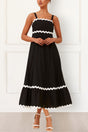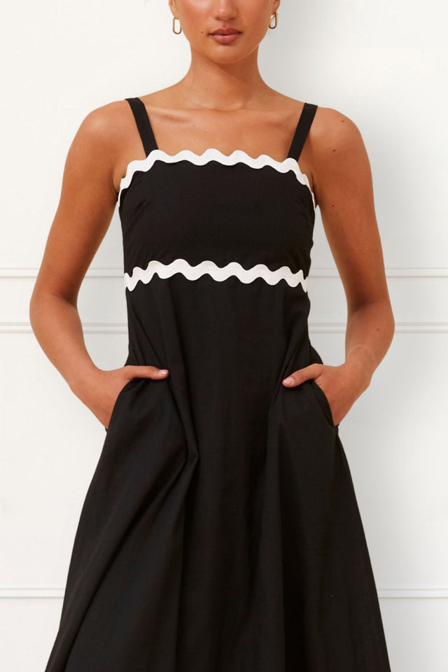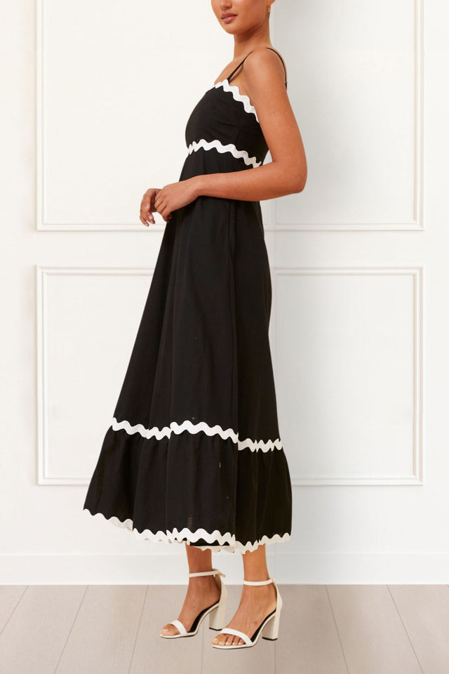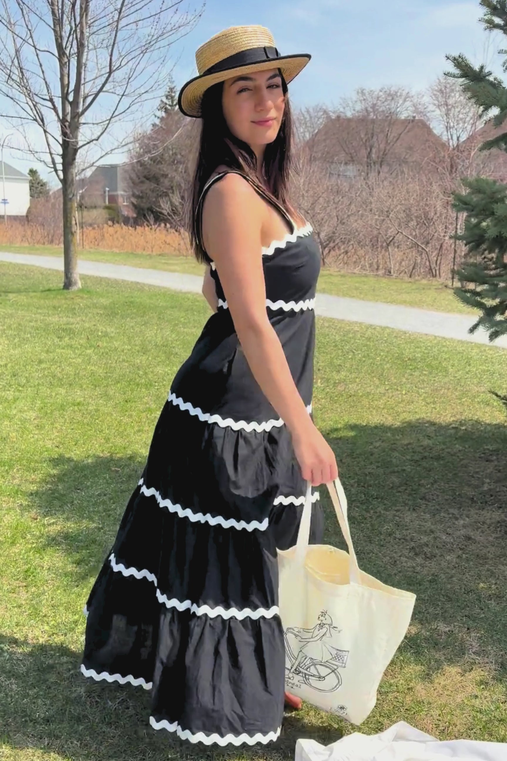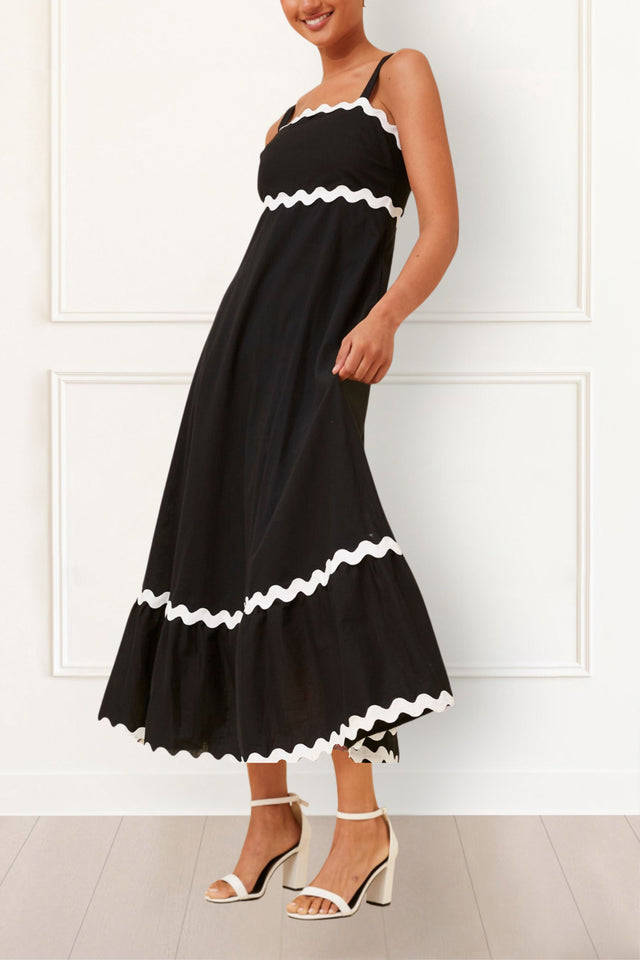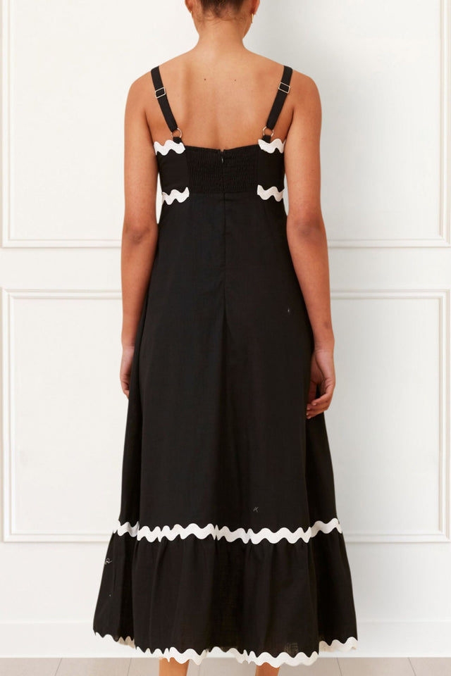 La robe longue Sienna est une pièce estivale saisissante, alliant contraste intemporel et charme sans effort. Confectionnée en coton noir frais avec un galon blanc en zigzag, elle est dotée de larges bretelles réglables et d’un ourlet évasé à volants pour une touche de mouvement ludique. Le panneau dos élastiqué offre confort et maintien, tandis que la doublure intégrale en coton garantit une sensation de légèreté et de fraîcheur tout au long de la journée.