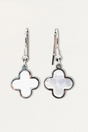 Boucles d'oreilles pendantes légères ornées d'un trèfle en nacre serti dans un cadre argenté poli. Un style épuré et facile à porter au quotidien.