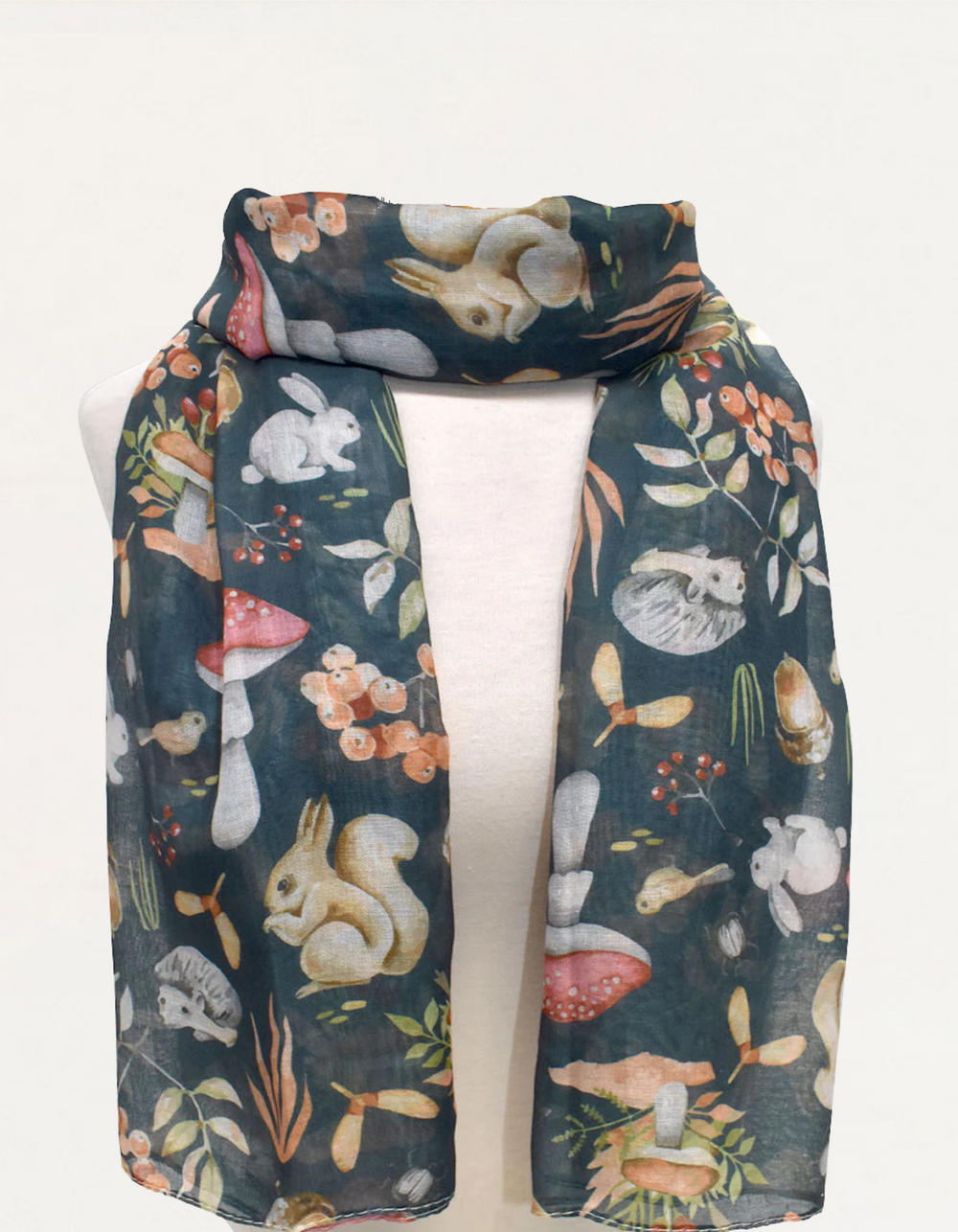 Enveloppez-vous du charme de la forêt avec cette écharpe aux motifs d'animaux des bois. Ornée de lapins, d'écureuils, de champignons et de feuillages d'automne sur un fond vert profond, elle est parfaite pour des looks d'automne douillets ou des tenues inspirées de la nature.