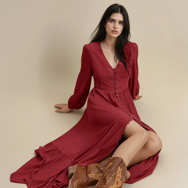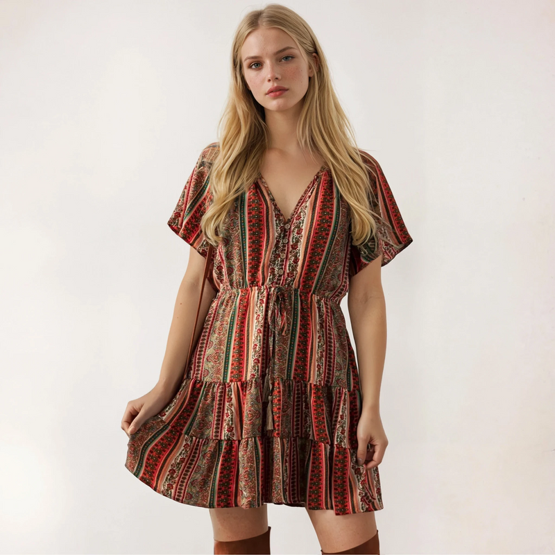 Alessandra Bohemian Floral Print Buttoned V Neck Ruffle Tiered Dress