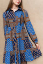 This boho-chic shirt dress showcases a striking patchwork print in rich blue tones, blending floral and geometric patterns for a vintage-inspired look. Designed with long sleeves and a classic button-up collar, it offers a perfect balance of structure and flow. The relaxed silhouette makes it ideal for both casual outings and semi-formal occasions. Effortlessly stylish and versatile, this dress transitions seamlessly from day to night, adding bohemian charm to any wardrobe.