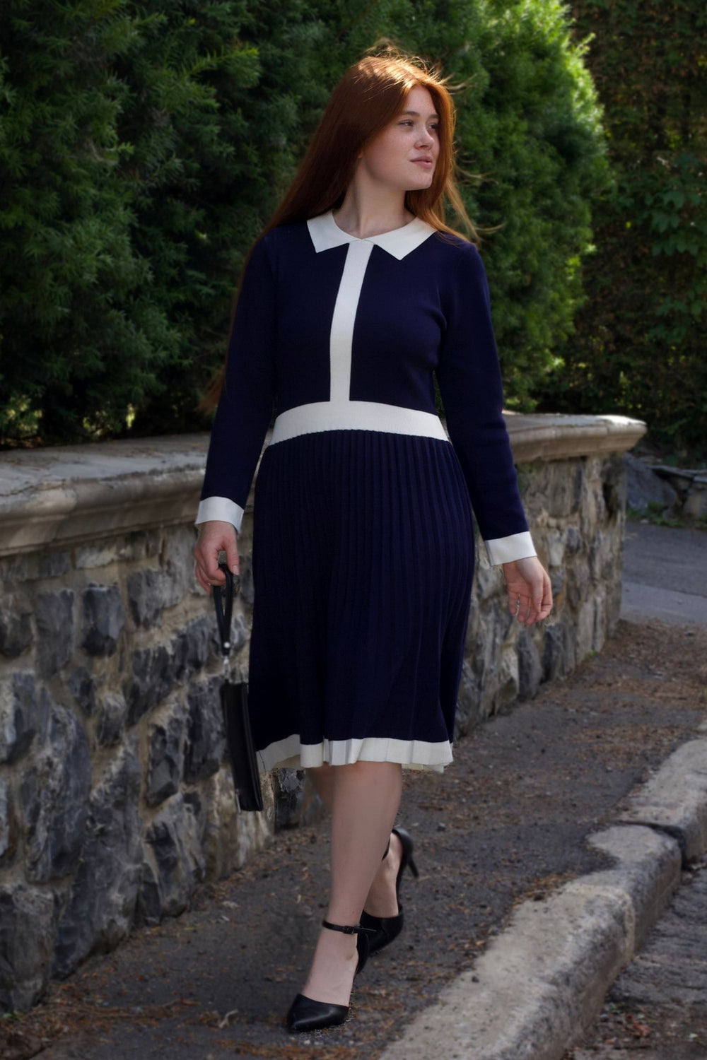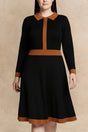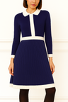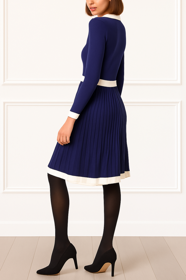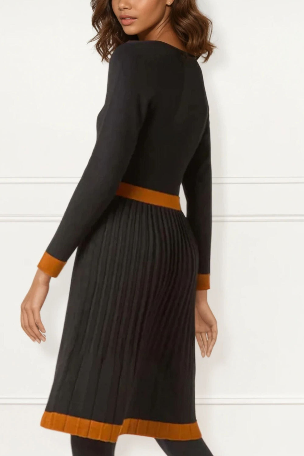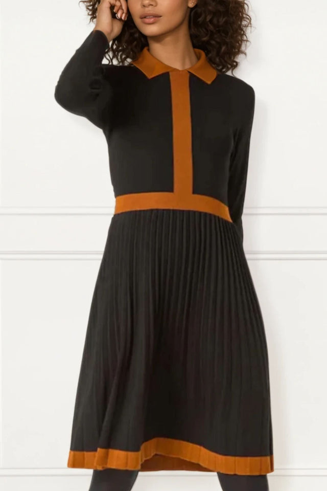 The Clarissa dress blends timeless elegance with subtle vintage flair in a flattering fit-and-flare silhouette. Designed with a soft, structured knit, this dress features bold contrast trim that highlights the waist, collar, and cuffs, creating a refined yet playful look. The pleated skirt adds graceful movement, while the long sleeves offer all-season versatility. Available in two striking colorways—classic black with warm rust and deep navy with crisp ivory—Clarissa is a polished choice for workdays, gatherings, or city strolls.