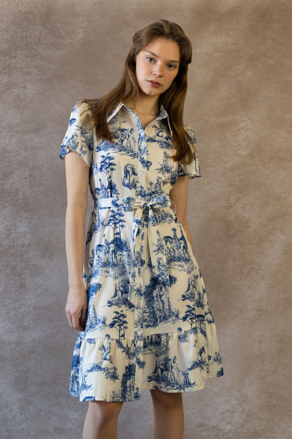 Elevate your summer wardrobe with this elegant belted shirt dress featuring a classic blue and white Toile de Jouy print. Designed for timeless style and everyday comfort, this lightweight button-down dress includes short sleeves, a flattering tie waist, and feminine ruffle hem. Perfect for women who love vintage-inspired fashion with a modern fit.