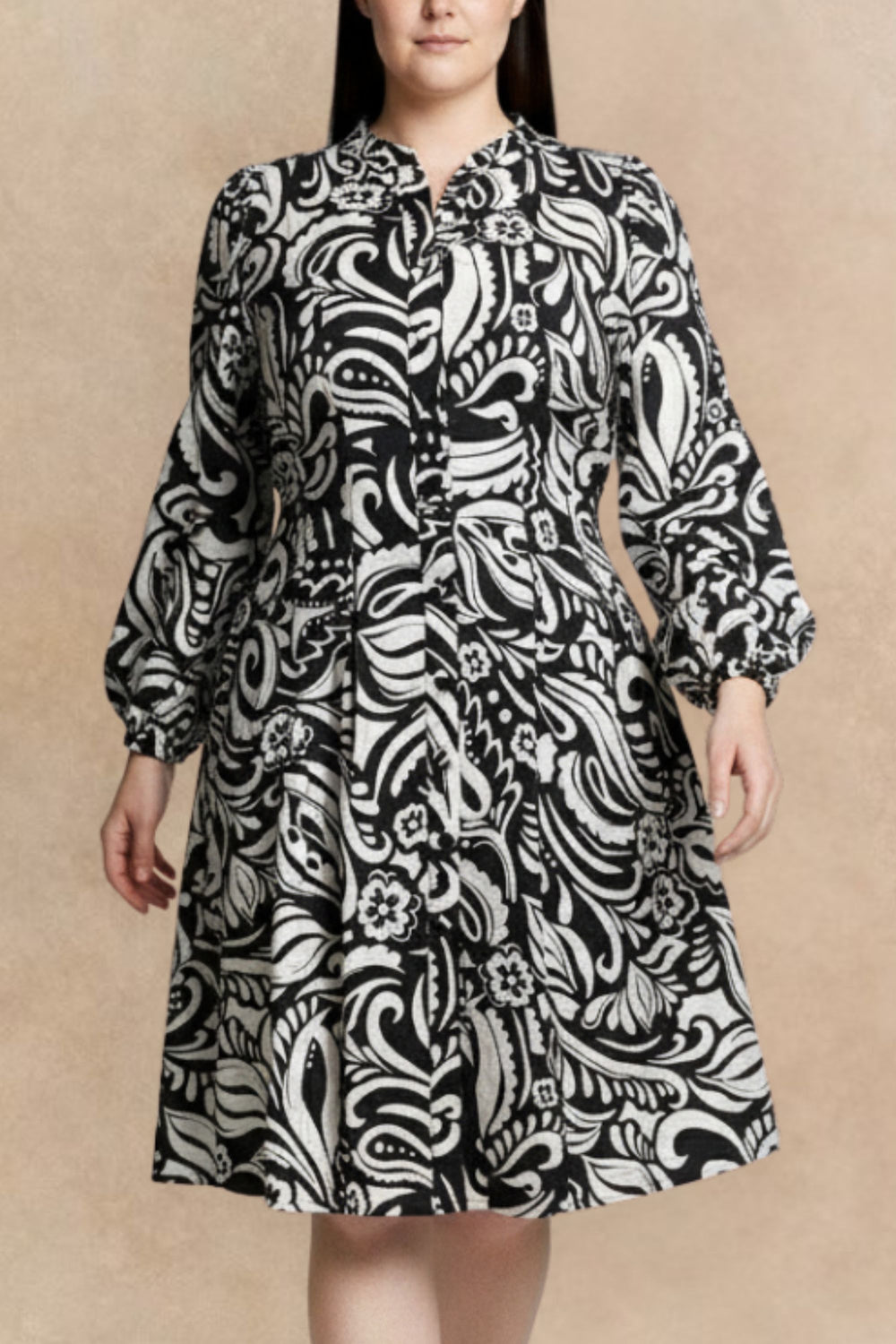 The Eleanor dress is a timeless statement piece, featuring an elegant black and white abstract print that adds artistic flair to your wardrobe. Designed with a classic silhouette and long sleeves, this dress blends structure with softness for effortless day-to-night style. Whether worn with boots or layered with a blazer, Eleanor delivers polished comfort with standout visual appeal.