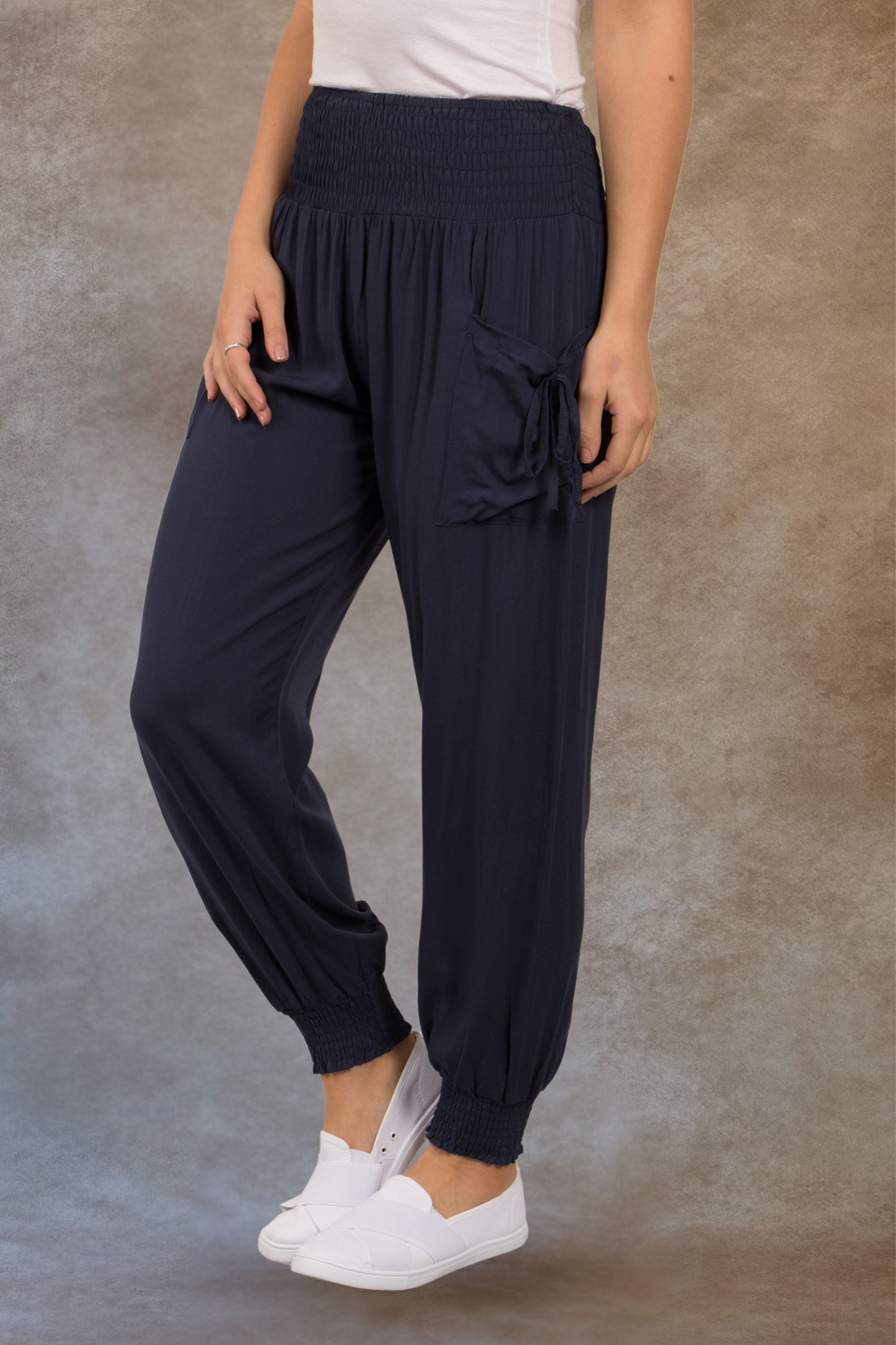 Nadine Harem Pants Solid Smocked Waist Pockets Side Ties