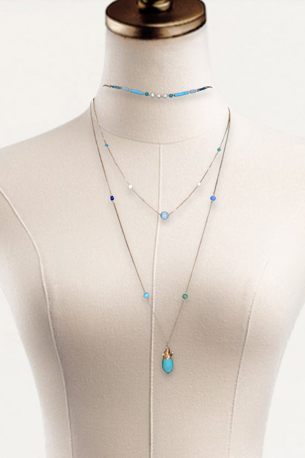 This layered necklace features a choker with delicate beads, a mid-length chain with pearls and stones, and a turquoise drop.