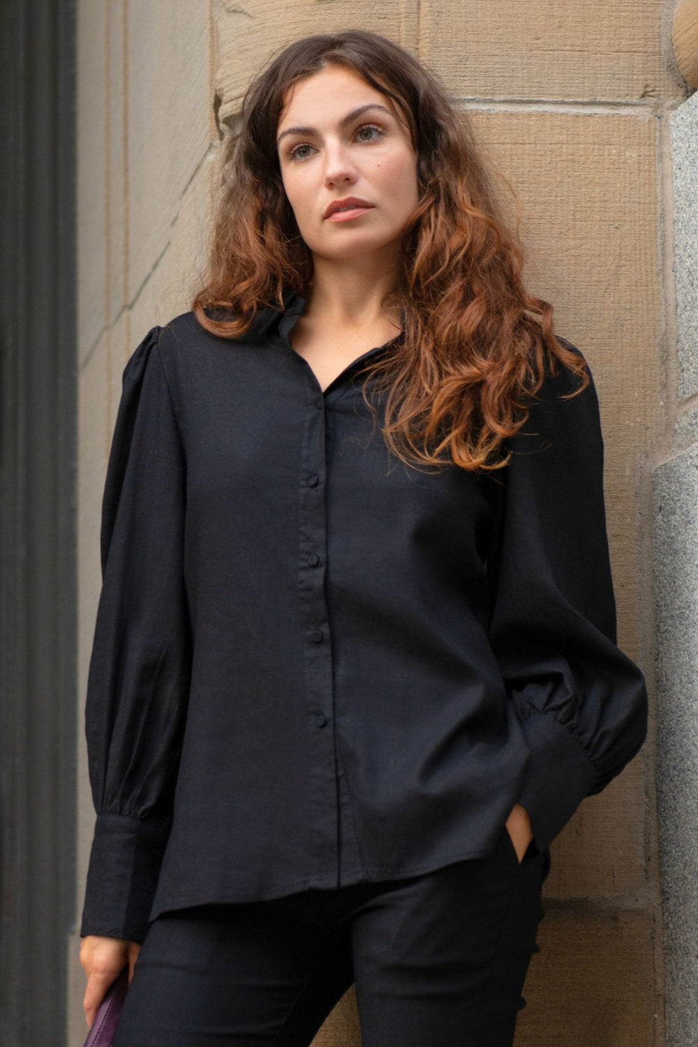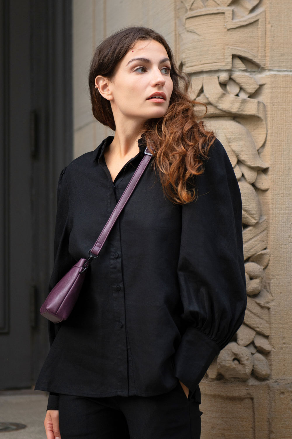 Superior quality shirt, expertly crafted from the finest linen blend, this shirt features elegant princess sleeves for a distinctive designer touch. The self-covered button front, refined cuffs with a three-button opening, and side slits combine to create a perfect balance of sophistication and playfulness.