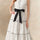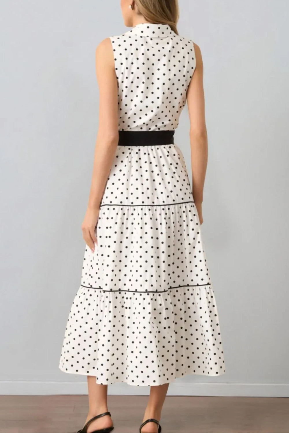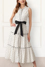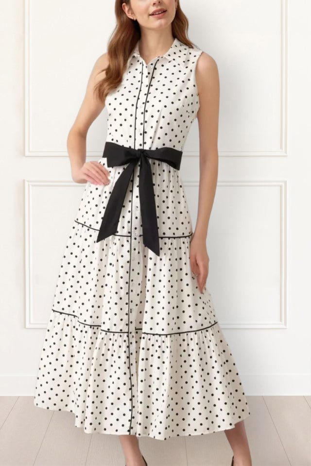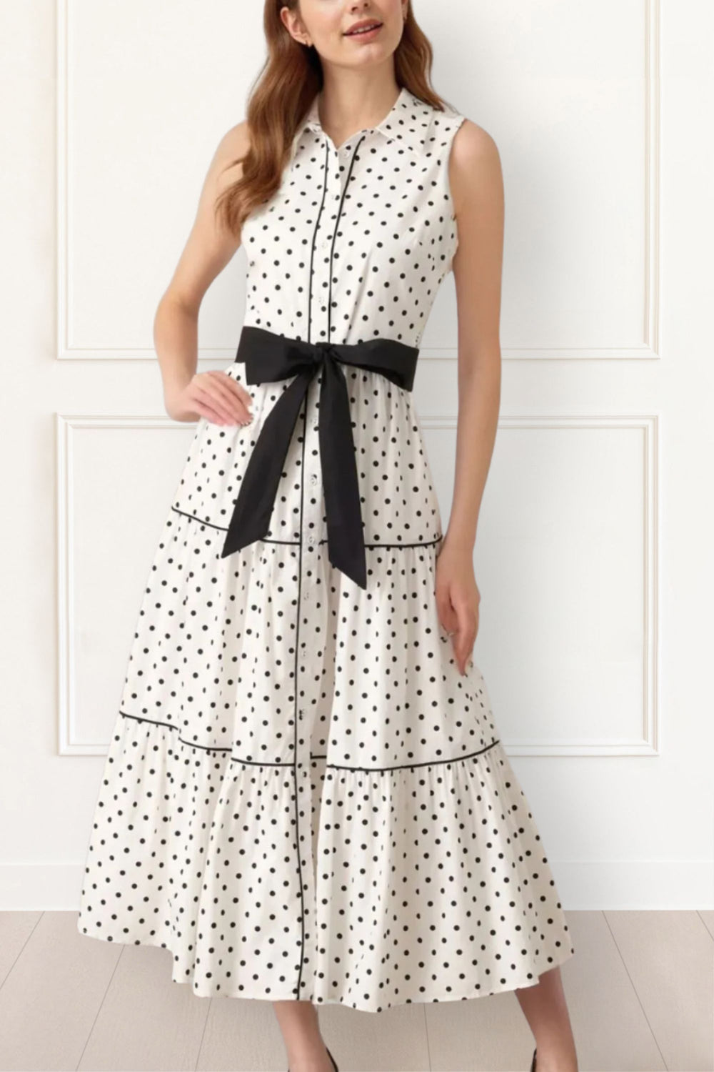 Channel timeless charm with this sleeveless polka dot midi dress, designed to flatter with its classic silhouette and feminine details. Featuring a black polka dot print on a white base, this dress includes a collared neckline, tiered skirt, and a striking black ribbon belt that cinches the waist beautifully. Whether you're heading to a summer garden party, brunch date, or simply want to elevate your daytime look, this piece is a go-to for sophisticated style with a playful twist.