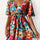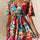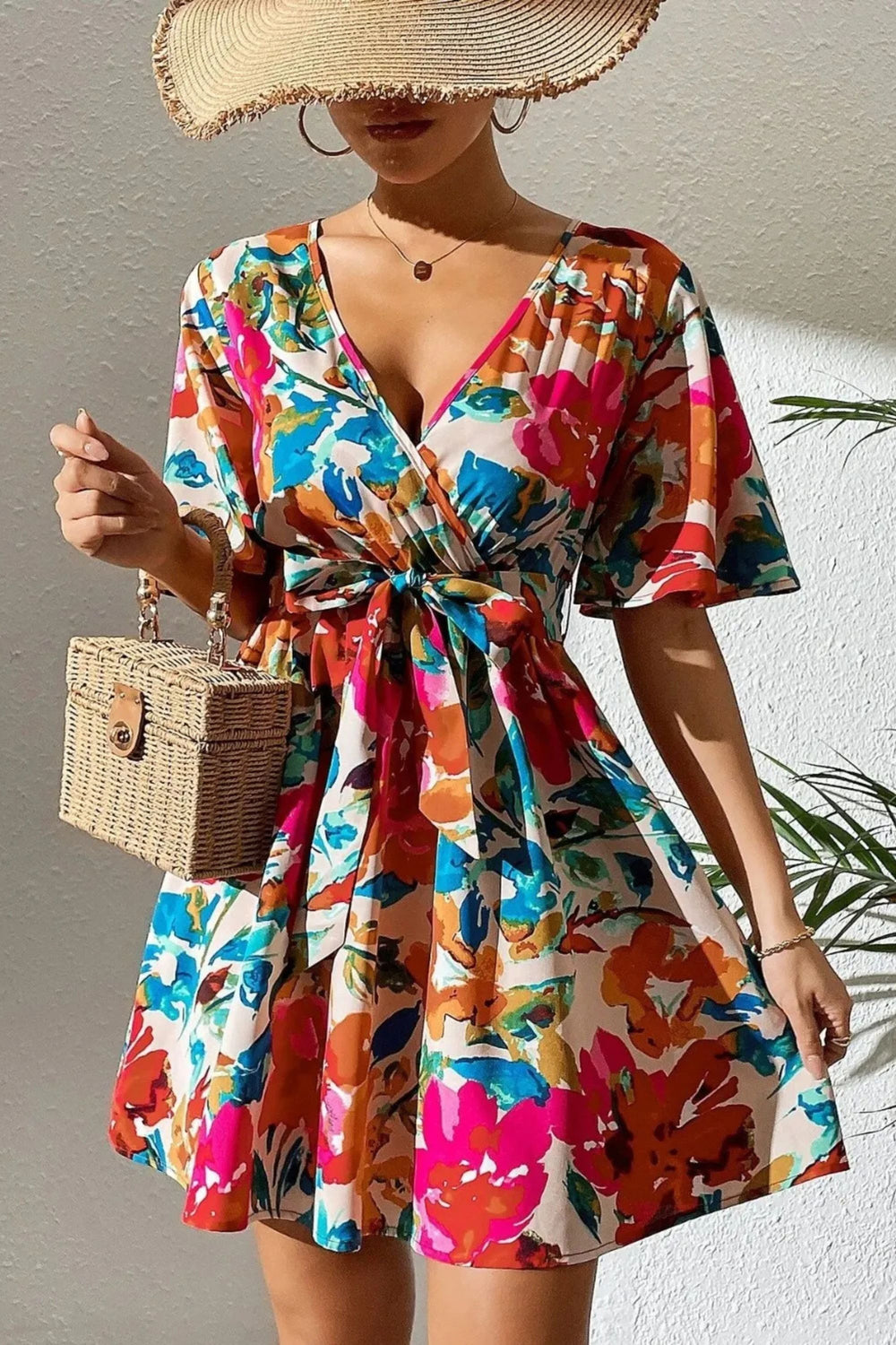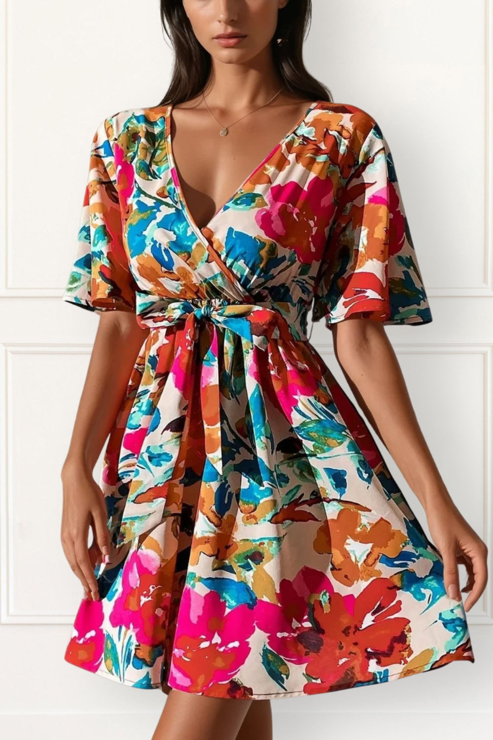 Step into summer with bold color and breezy elegance in this vibrant floral wrap dress. Featuring a flattering V-neckline and classic short sleeves, this mini dress ties at the waist for a figure-enhancing silhouette. The abstract floral print in rich tones of fuchsia, orange, teal, and coral pops beautifully against the light background, creating a look that's both playful and polished.