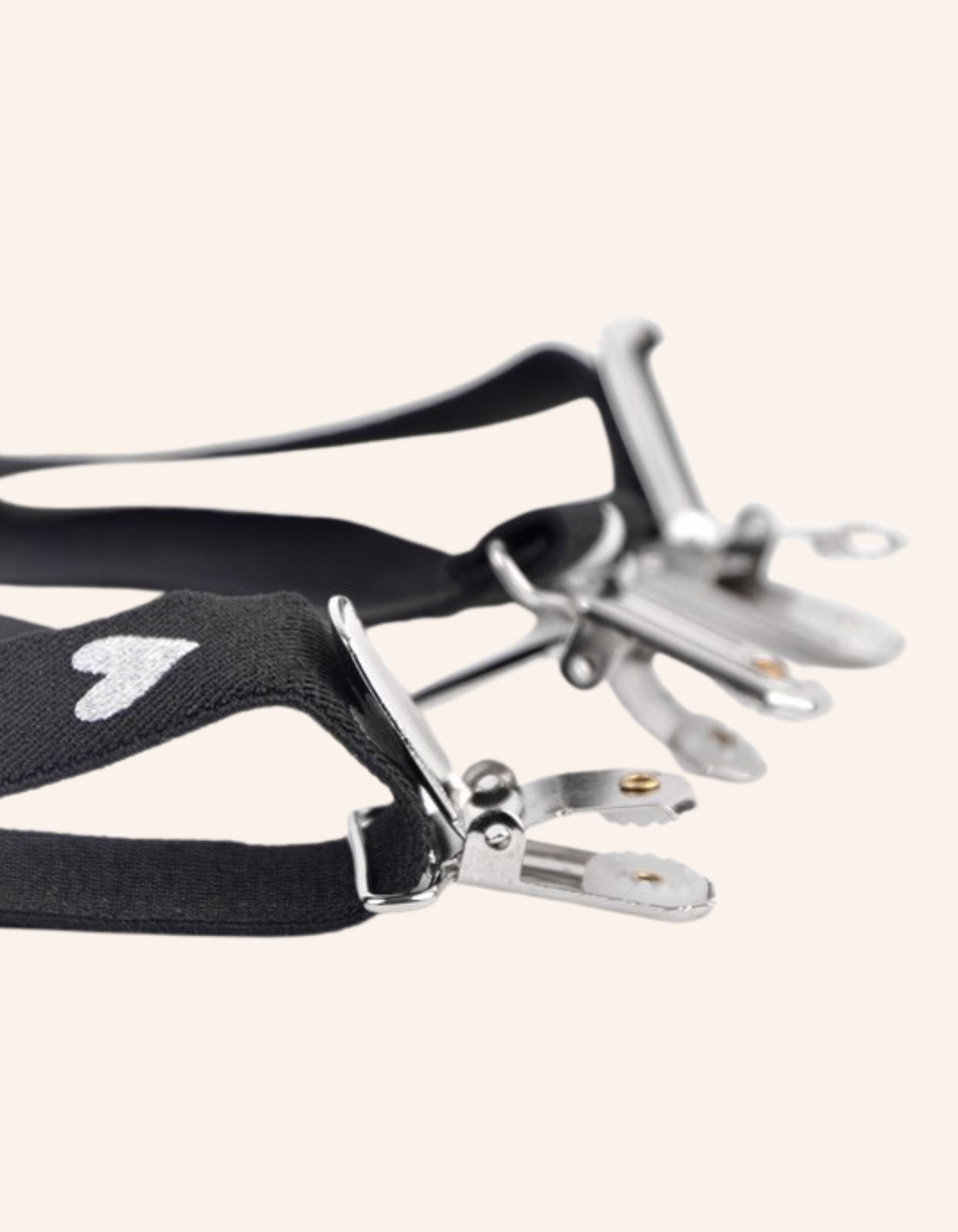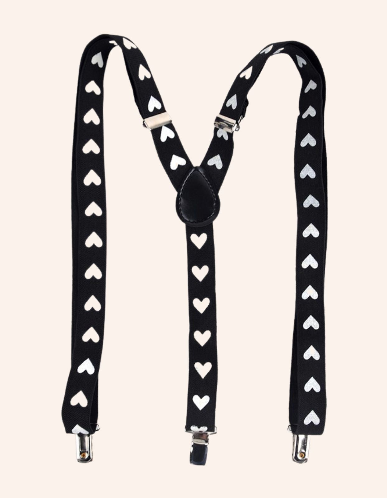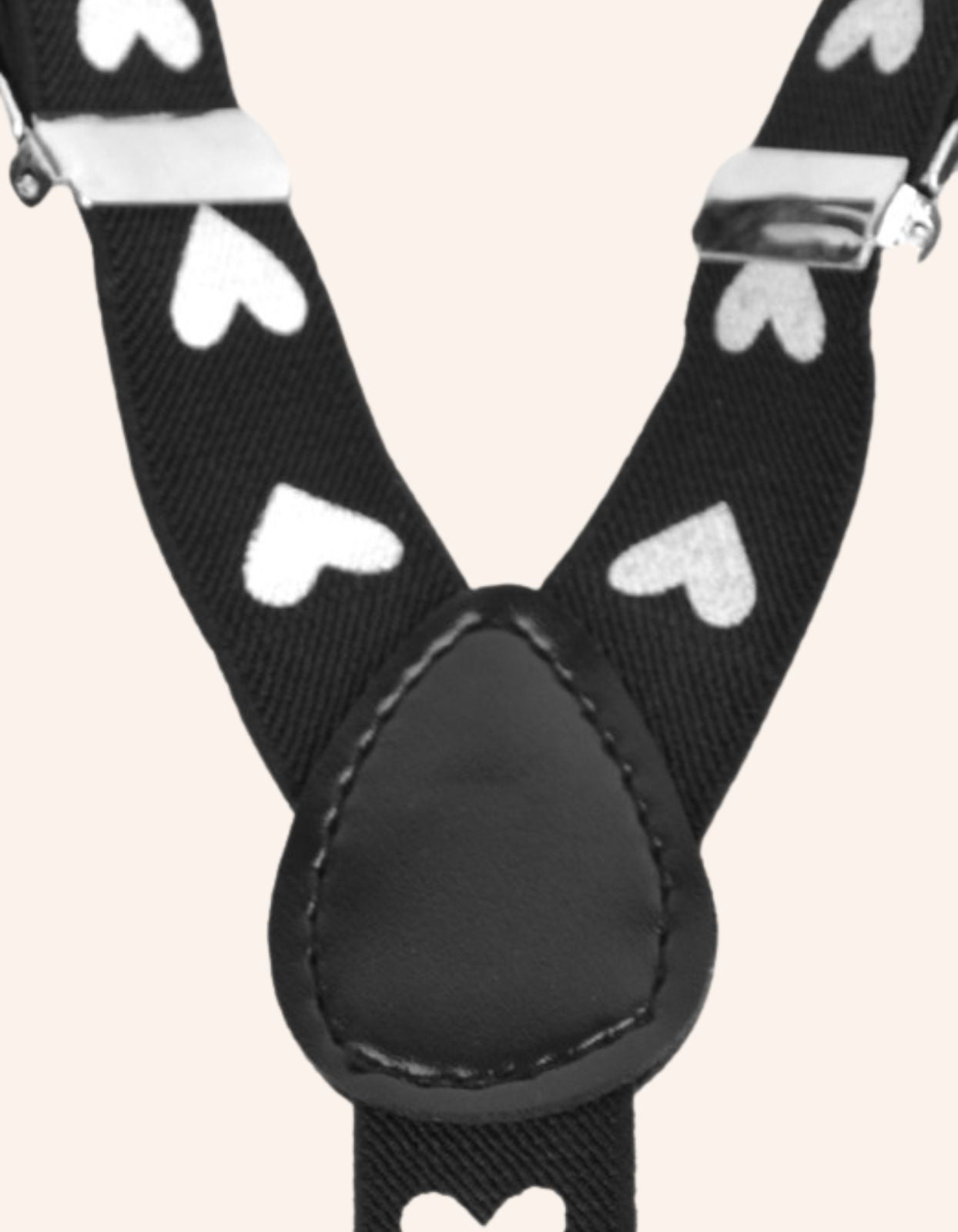 Vintage inspired adjustable elastic suspenders with cute white heart print on solid black ground color. For work or any occasion, add some fun to your outfit