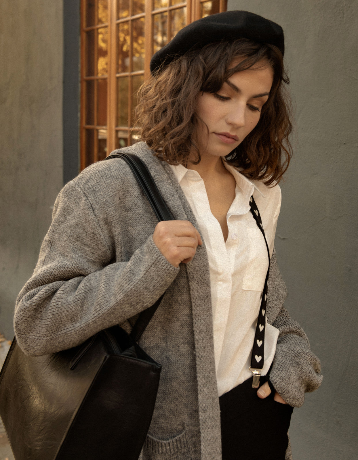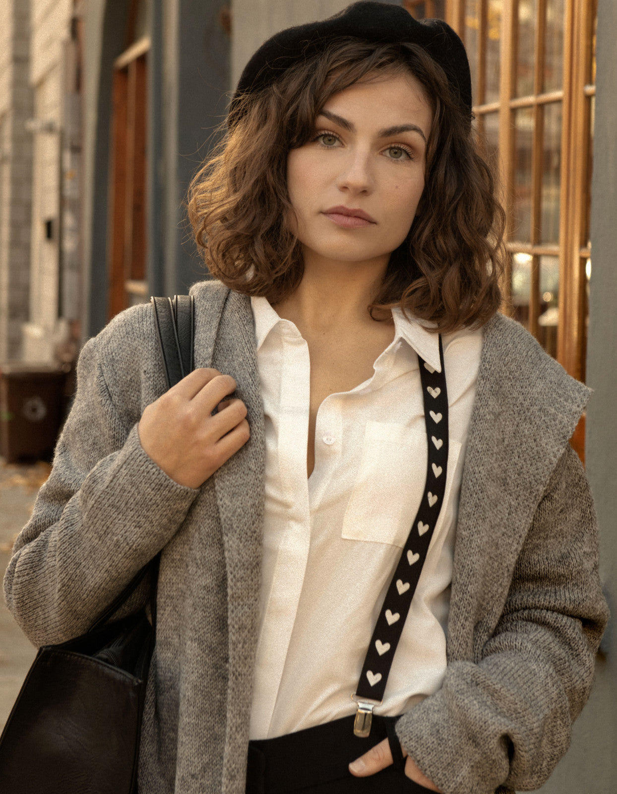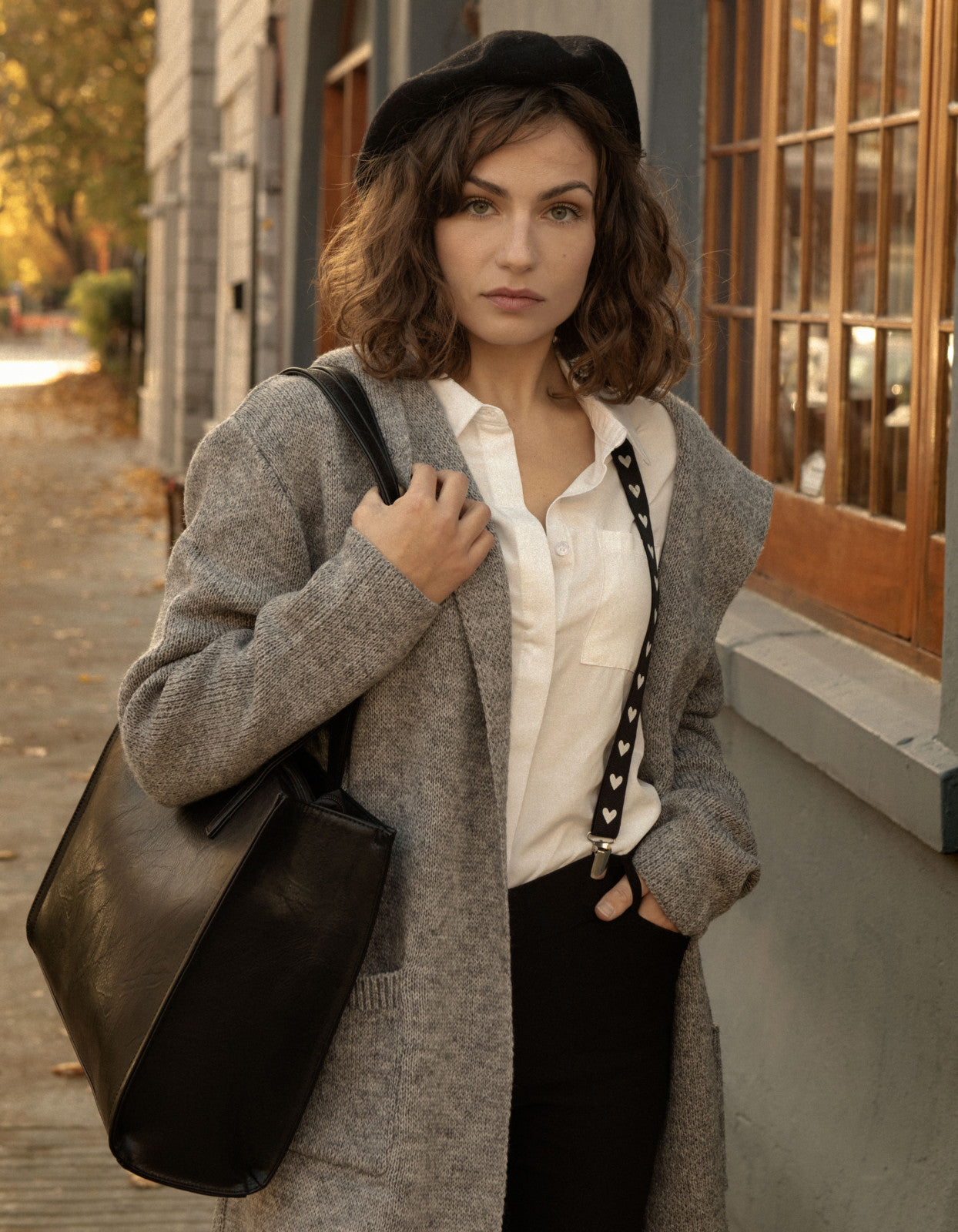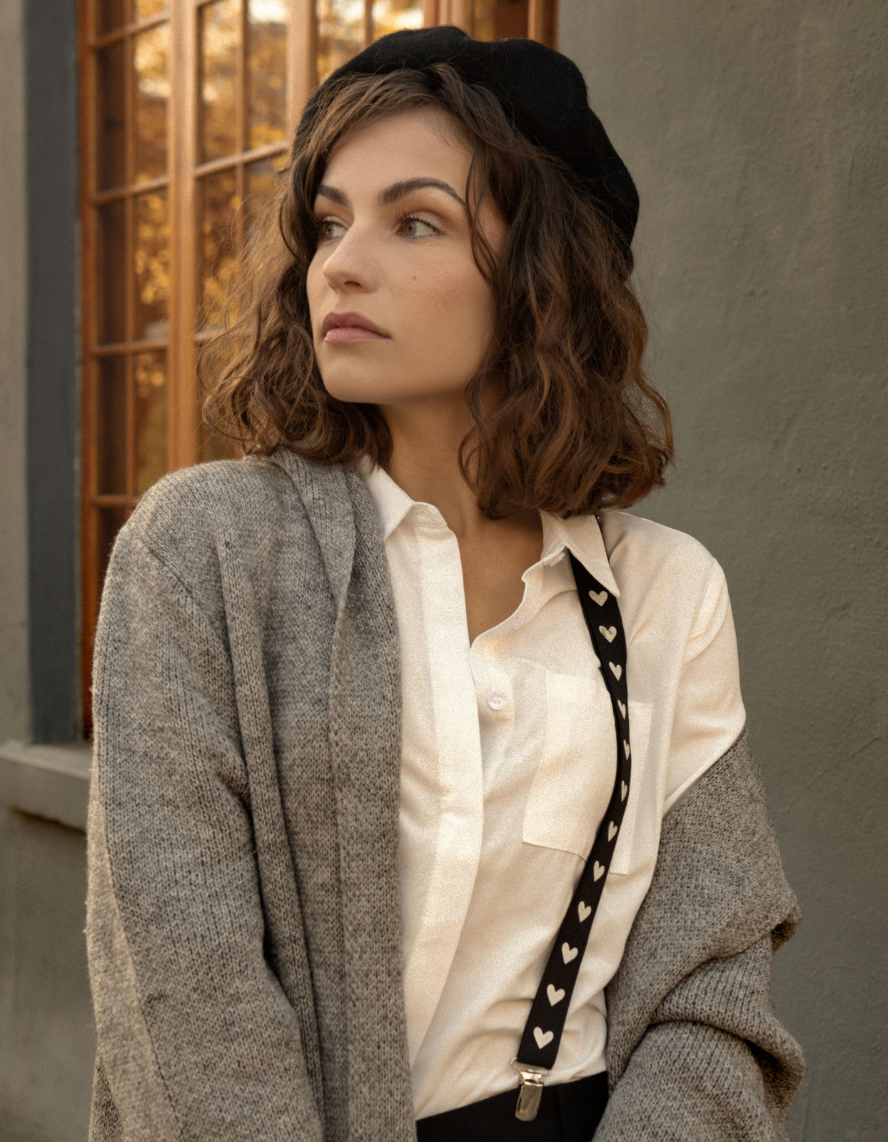 Vintage inspired adjustable elastic suspenders with cute white heart print on solid black ground color. For work or any occasion, add some fun to your outfit