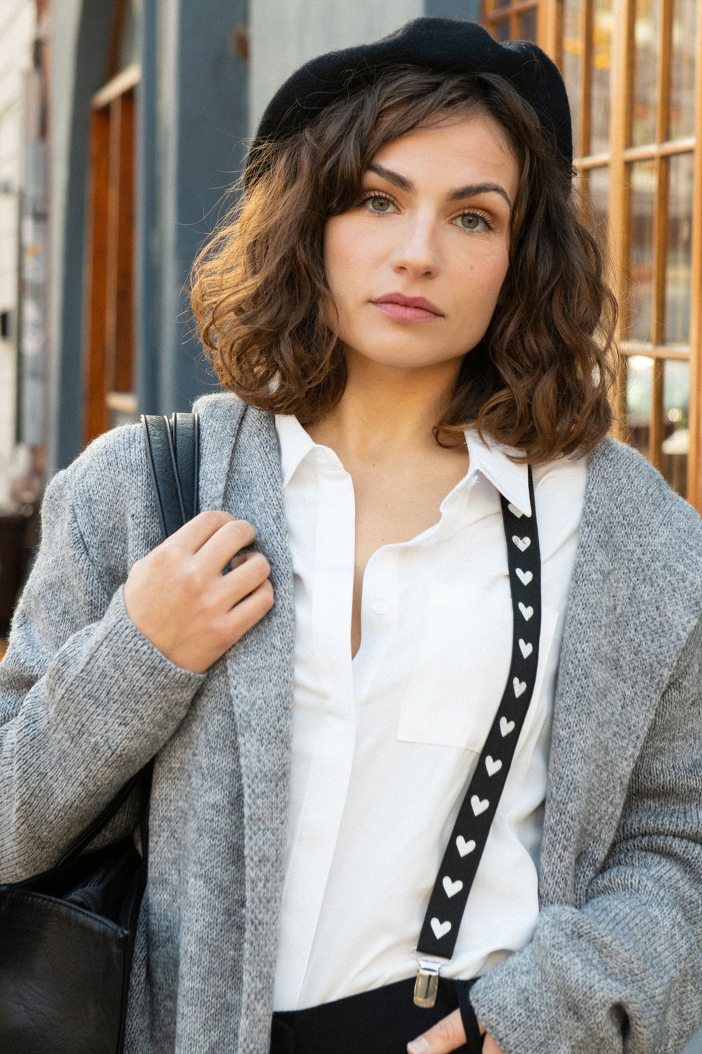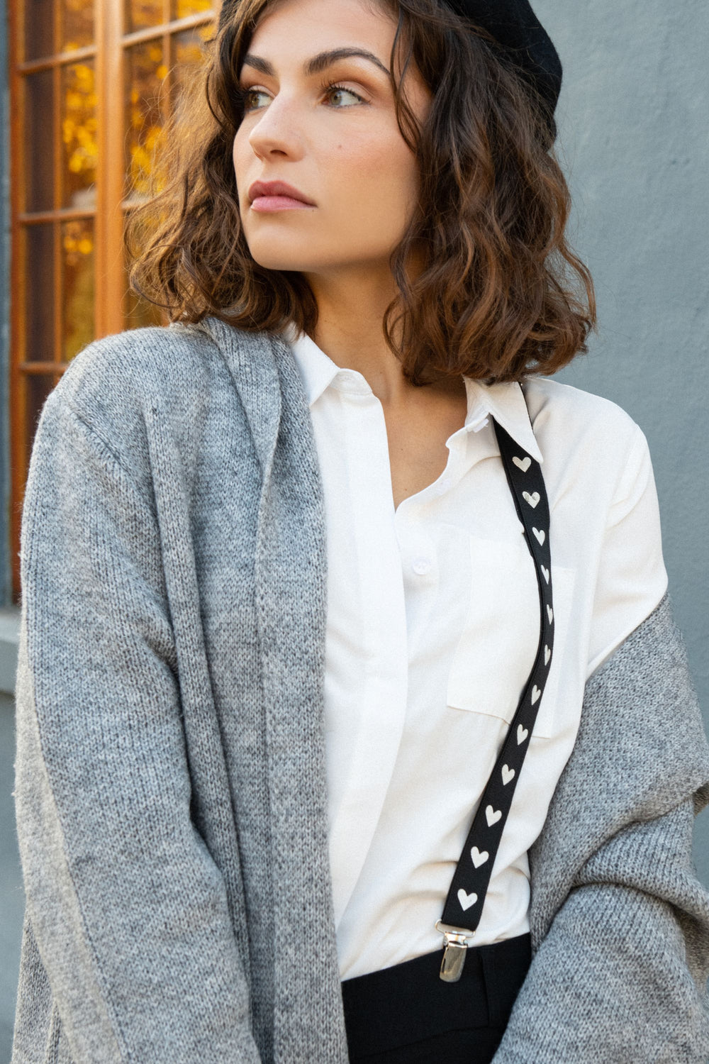 Vintage inspired adjustable elastic suspenders with cute white heart print on solid black ground color. For work or any occasion, add some fun to your outfit